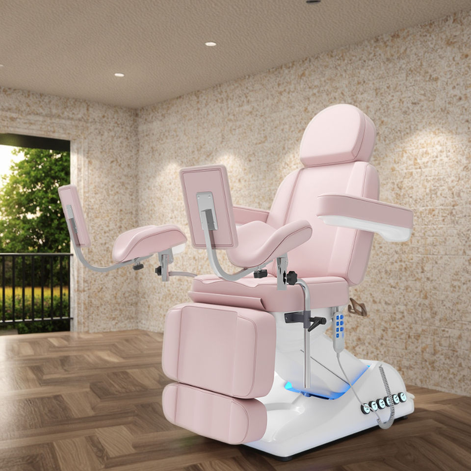 Chaise d'examen gynécologique multifonctionnelle, chaise d'examen colposcopique à trois moteurs rose avec pédales