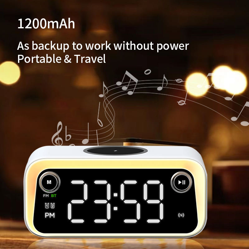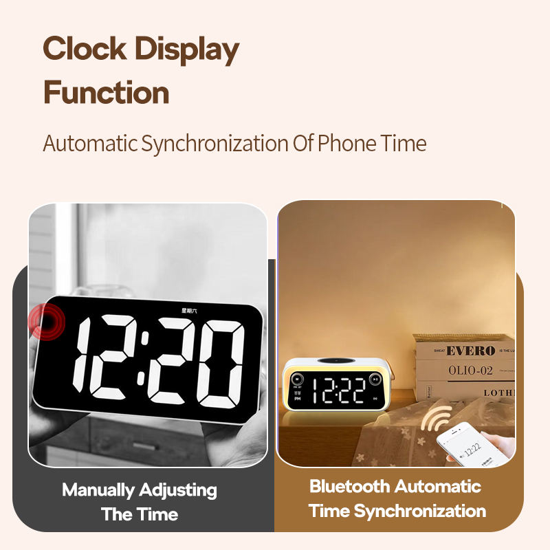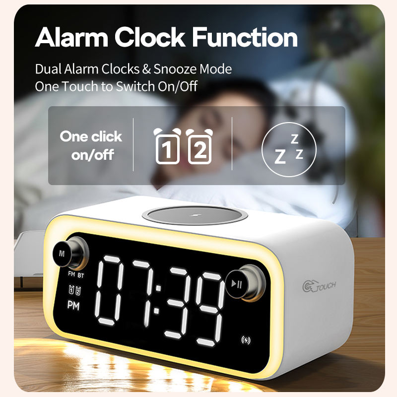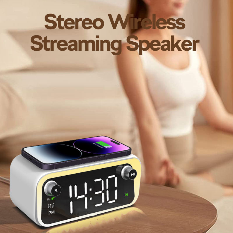 Charge sans fil, BT V5.3, Smart Touch, Affichage LED de temps, Snooze