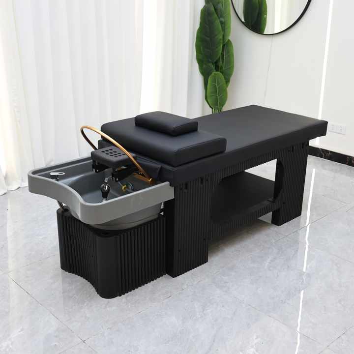 Fauteuil de lavage multifonctionnel moderne de style japonais pour salon de beauté, avec cadre en fibre de verre et revêtement en cuir, idéal pour barbier et spa capillaire hydrothérapeutique
