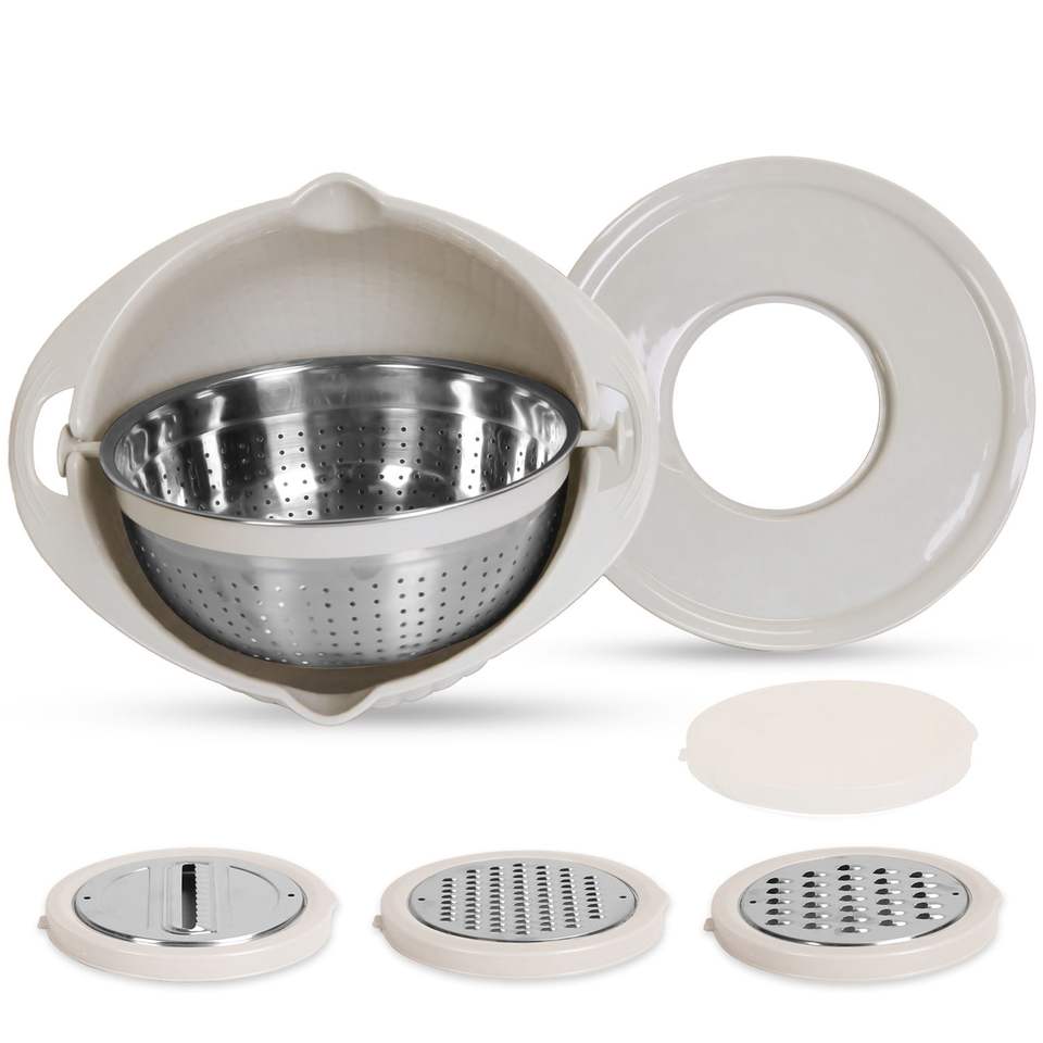 Ensemble de couvercles multifonctionnels en acier inoxydable pour bols mélangeurs, avec 3 râpes interchangeables, passoire, égouttoir et panier de lavage pour fruits et légumes
