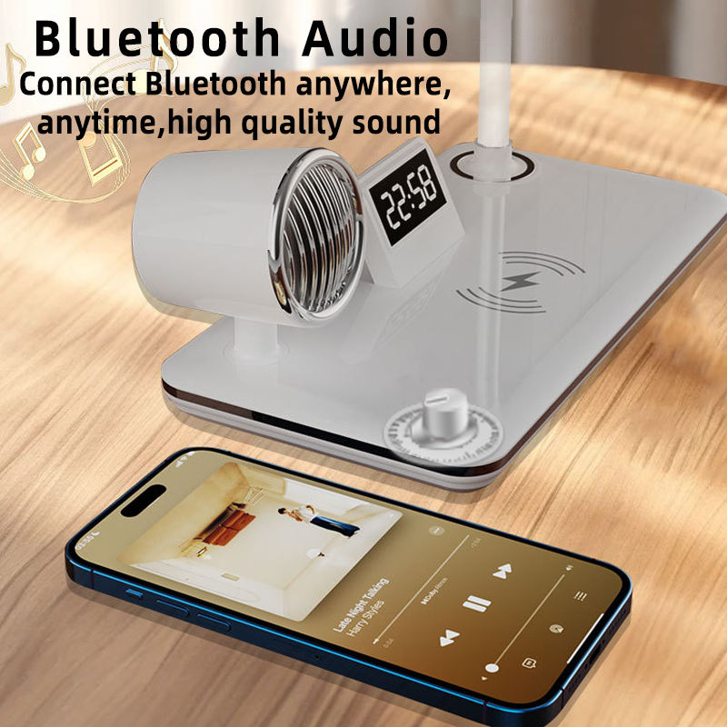 Lampe de bureau avec chargeur sans fil bt haut-parleur et horloge numérique