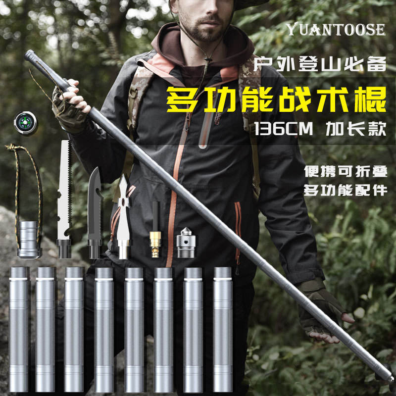 Bâton de trekking multifonctionnel en alliage d'aluminium, réglable, pour le camping, la survie en plein air, tactique, avec boussole et outils