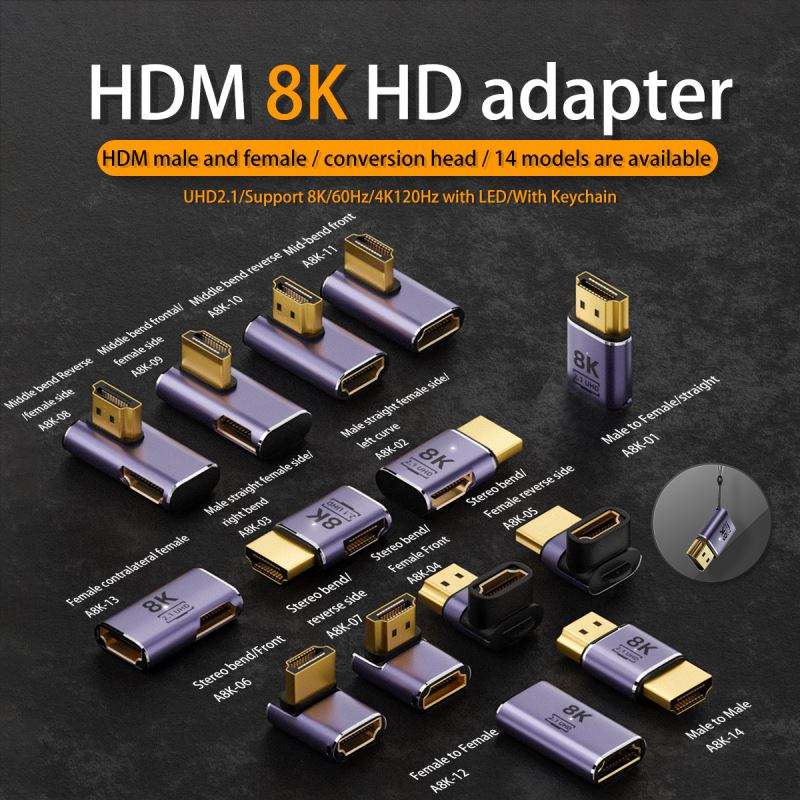 Adaptateur HDMI mâle vers HDMI femelle à angles multiples, transfert audio 8K HD, convertisseur de données vidéo pour TV et ordinateur portable avec indicateur