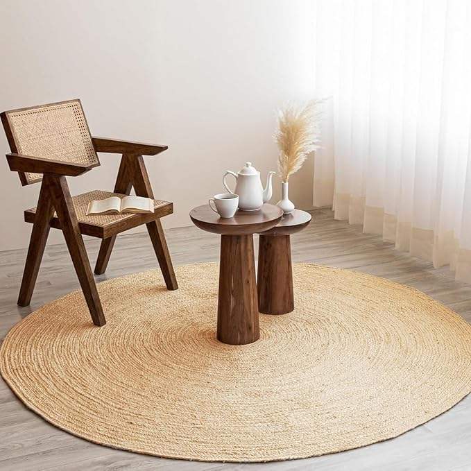 Tapis rond en jute bicolore multifonctionnel, durable, fait main, en fibres naturelles, pour salon, salle à manger ou coin détente.