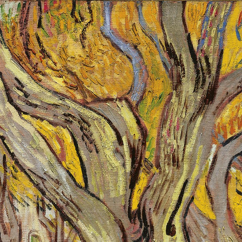 Reproduction de niveau muséale du tableau « Les grands platanes » de Vincent Van Gogh sur toile, utilisant la technique de reproduction par peinture à l'huile