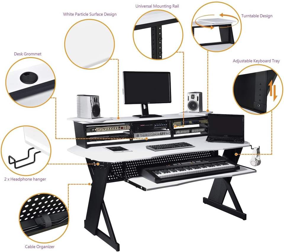 Bureau de studio d'enregistrement musical avec plateau pour clavier de piano, table de travail de studio d'enregistrement avec supports, étagère inférieure