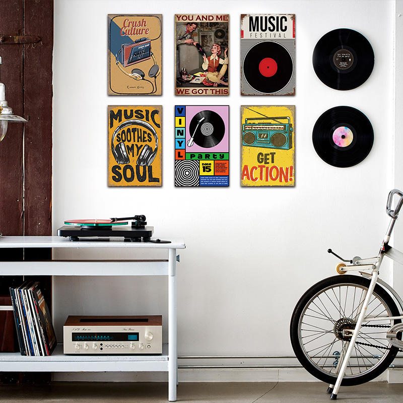 Panneau en métal rétro avec motif vinyle musical et tourne-disque, décoration murale pour studio, bar, cave des hommes et les amateurs de musique