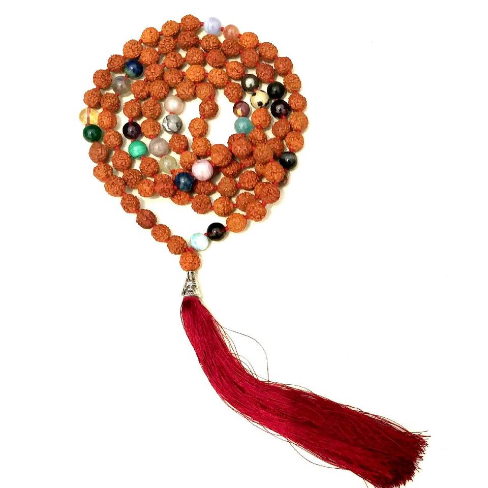 Collier Mala 108 perles nouées en Rudraksha naturel, fait main par des artistes indiens, style bohème, bijoux de yoga, à acheter absolument