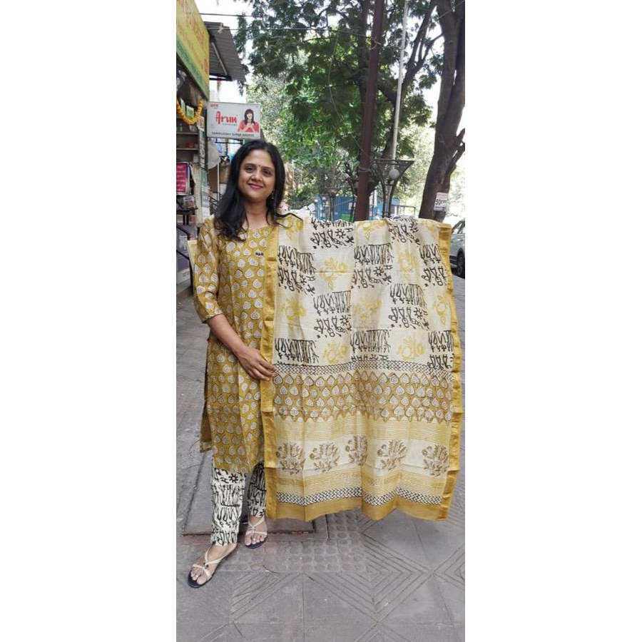 Combinaison Maheshwari imprimée en blocs jaune moutarde avec Dupatta