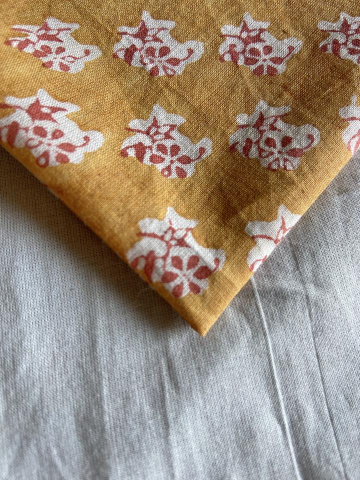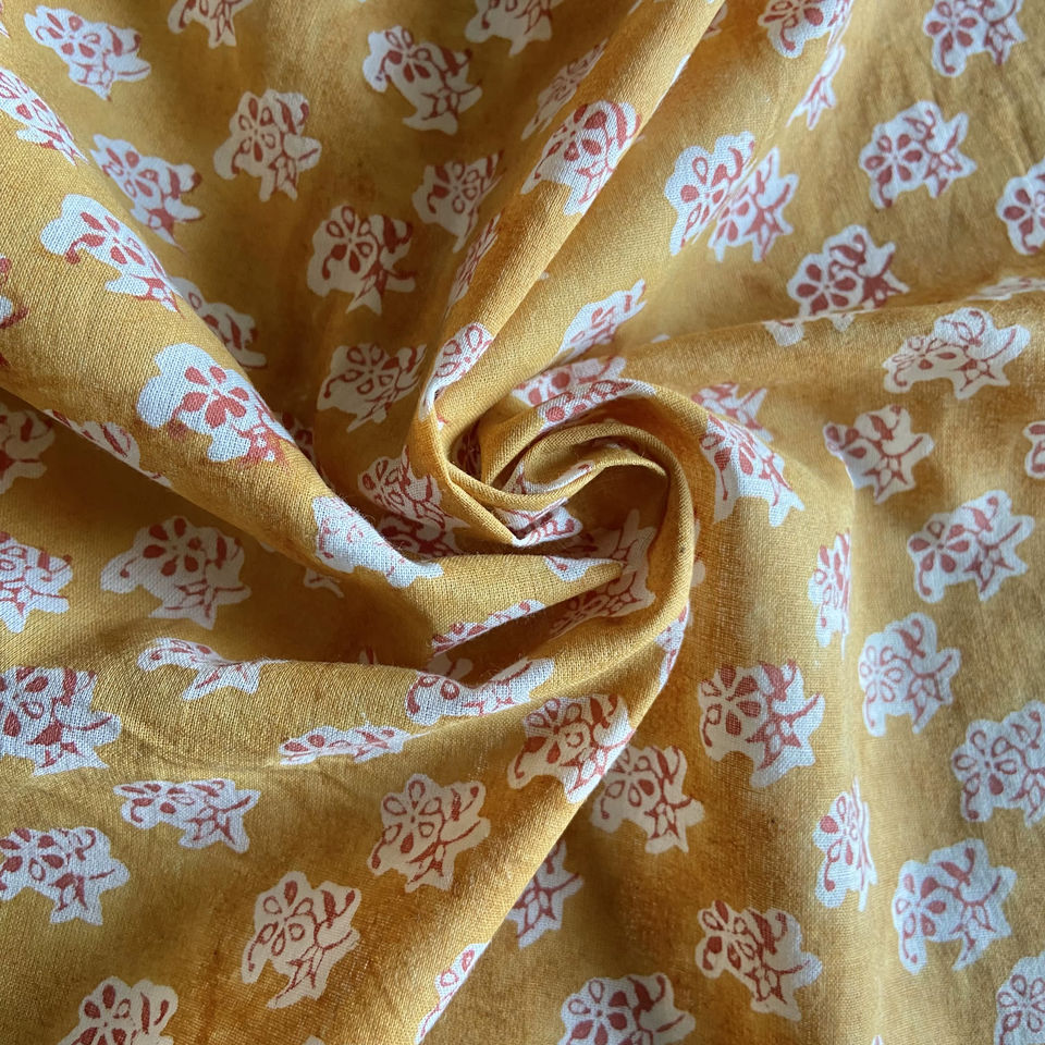 Tissu en coton imprimé à la main avec des motifs floraux jaunes moutarde, design traditionnel indo-ethnique