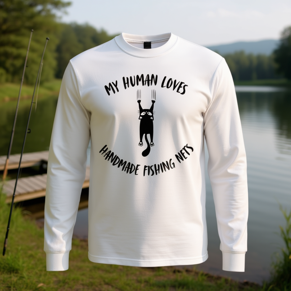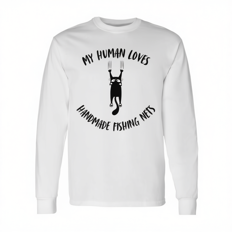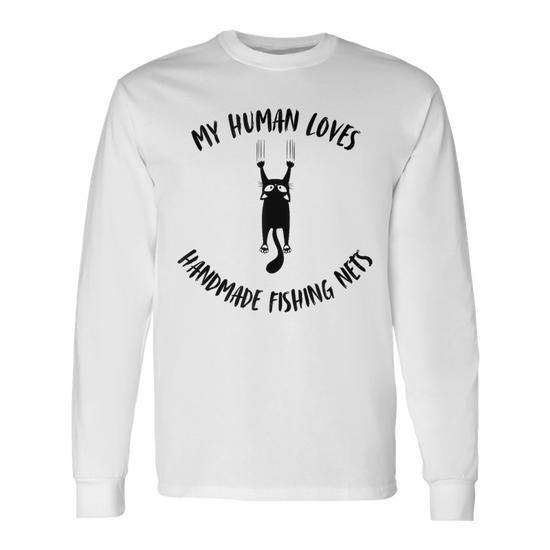 T-shirt à manches longues pour parents de chats, avec la phrase « Mon humain aime les filets de pêche faits à la main »
