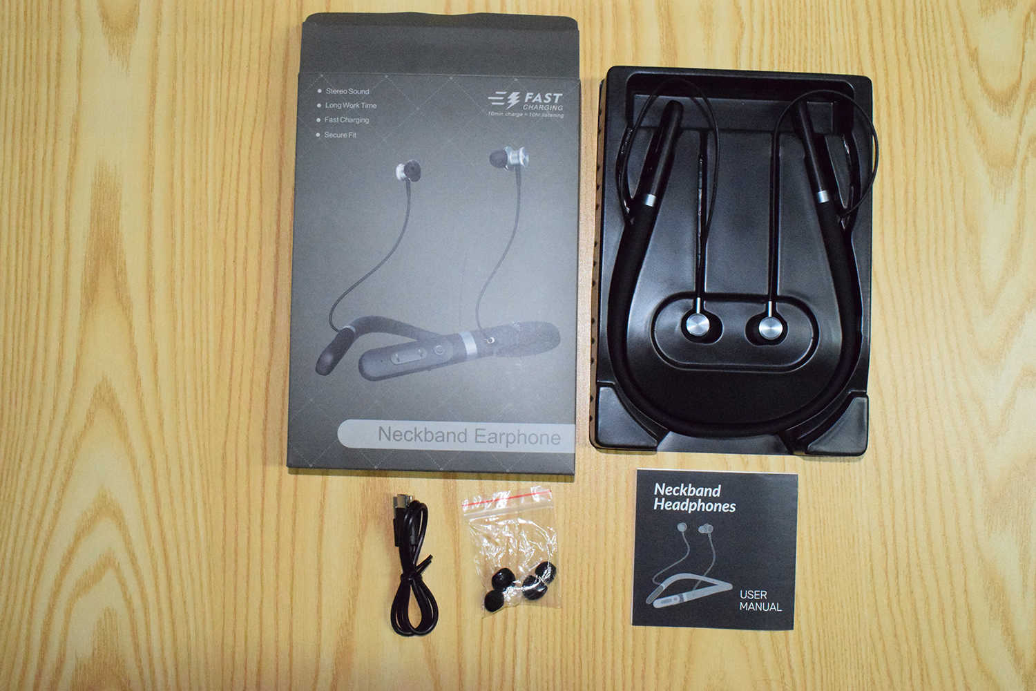 Color box, headset, charging cable, manual
