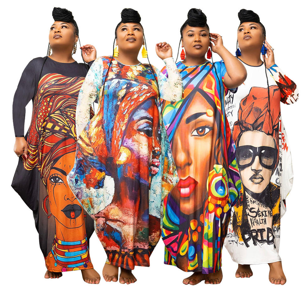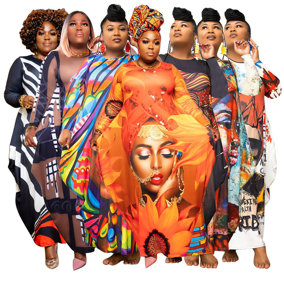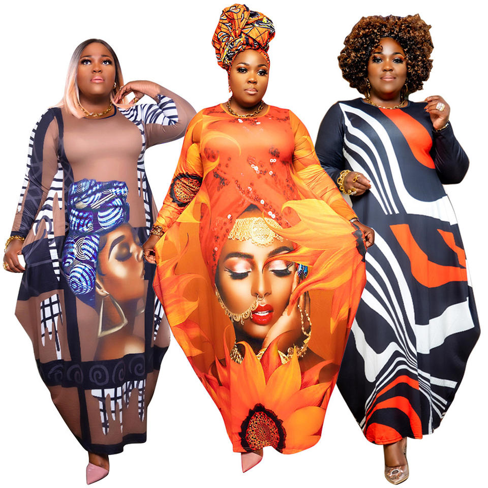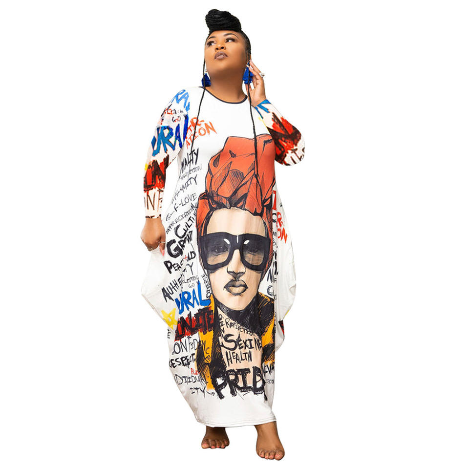 N7581 Robe longue asymétrique à manches longues pour femmes grandes tailles, style européen et américain, avec ourlet large et motifs imprimés