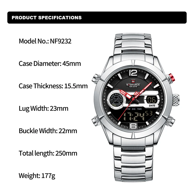 NAVIFORCE Montre à quartz analogique LCD pour hommes, lumineuse, numérique, business, bracelet en acier inoxydable, étanche, montre-bracelet pour hommes