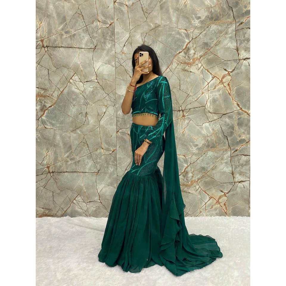 NOUVELLE ARRIVÉE GEORGETTE SEQUENCE À VOLANTS TRAVAIL LEHENGA BLOUSE AVEC FIXÉ DUPATTA VERT