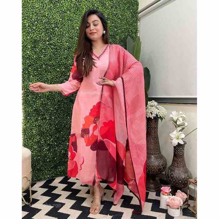 NOUVEAU ARRIVÉ MOUSSELINE IMPRIMÉE PIERRE TRAVAIL TOP BAS AVEC DUPATTA ROSE