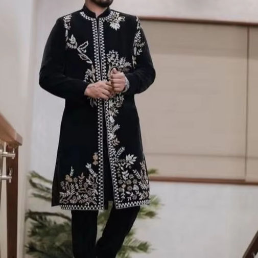 NEW-DAZZLING ATIYALIBAS GROOM BLACK SHERWANI PANT DRESS EMBELLISHED CRYSTAL GLASS BEADSSTONE DABKA WORK WOOL/SILK MATERIAL PLUS