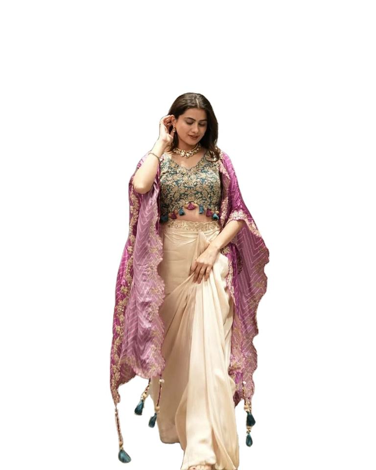 NEW Design& Pattern Punjabi Cultural Style Faux Fur Mono Net Blouse Draped Skirt Digital Printed Shrug Style Traditional Party