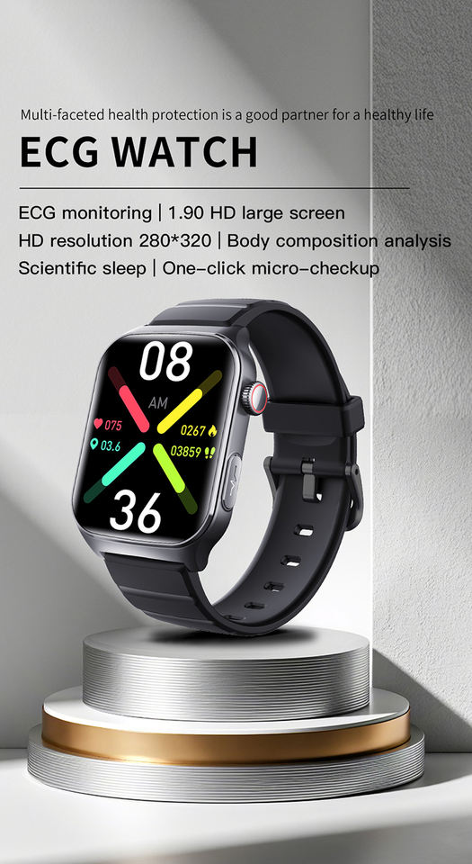 Nouvelle montre connectée de santé F320 ECG avec grand écran carré de 1,90 pouces, surveillance de la fréquence cardiaque, suivi du sommeil, détection des chutes, tracker de forme physique