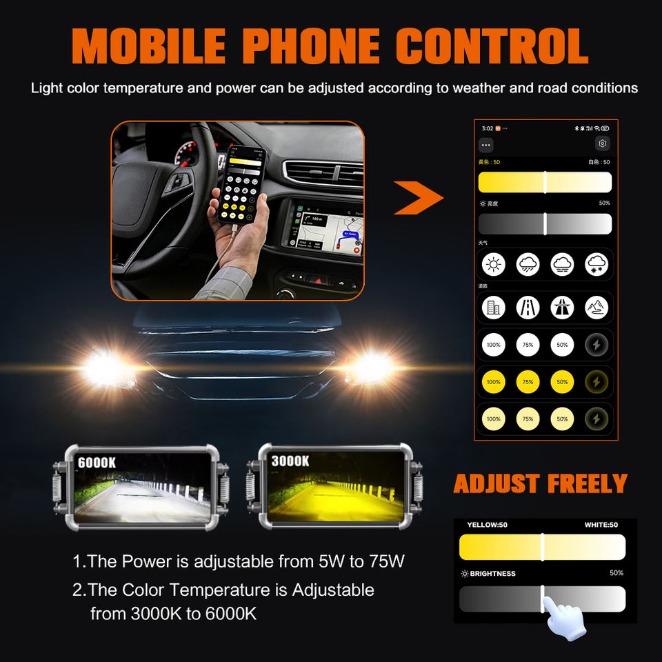NOUVEAU PRODUIT 75w 8000lm Phare à Led Ajustable 3000k 4300k 6000k Tri Color H1 H7 H11 H4 9005 9012 App Control Led Light for Car