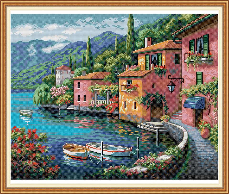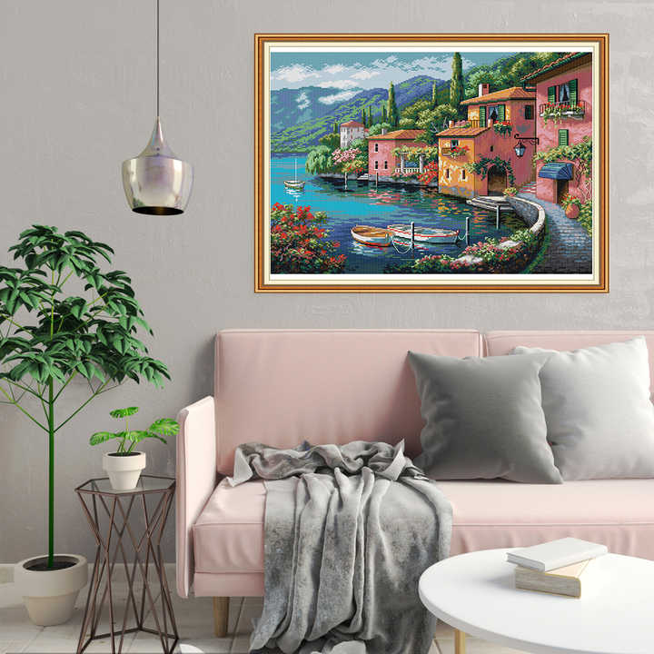NKF Colorful House by the Water Pattern Kit de point de croix Jouet de tissage et de couture pour débutants avec outils et fils comprenant du tissu