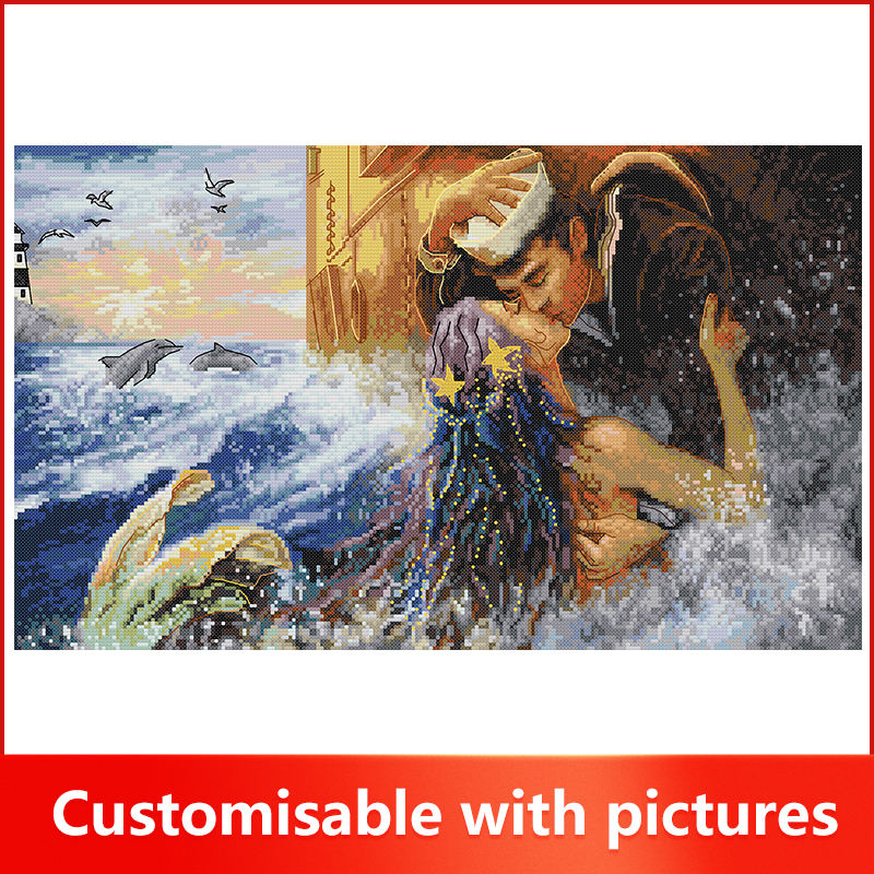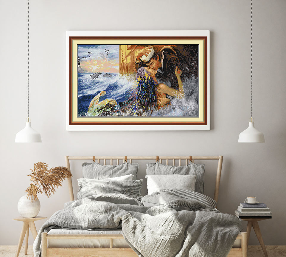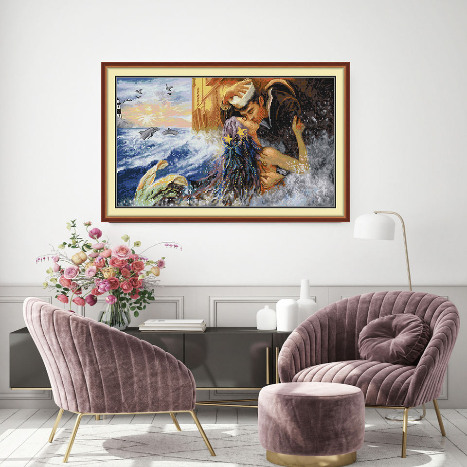 NKF Kit de point de croix en toile de coton avec motif Kiss the Mermaid Goodbye Figure Theme Living Room Decoration Embroidery Set