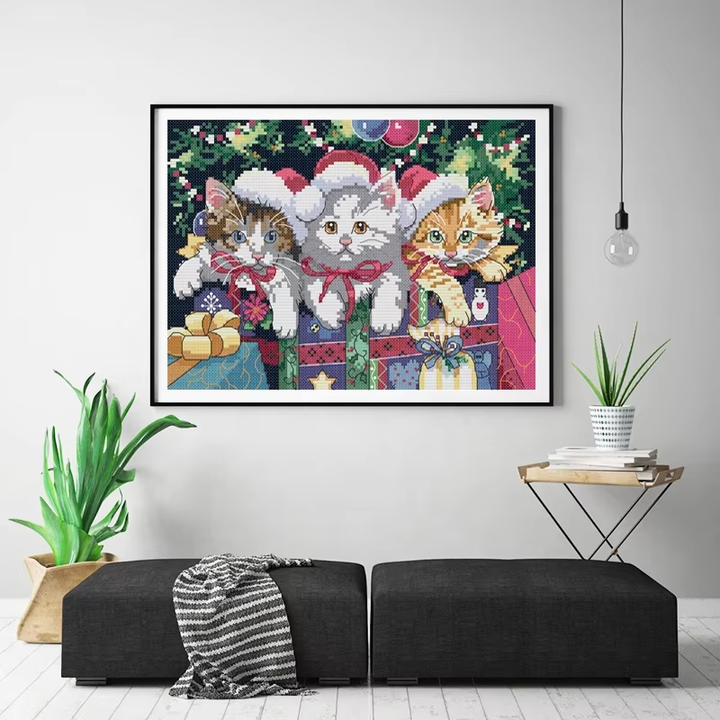 NKF Broderie personnalisée, motif de point de croix de Noël avec chat, kits de point de croix 3D DIY, fils DMC, tissu Aida