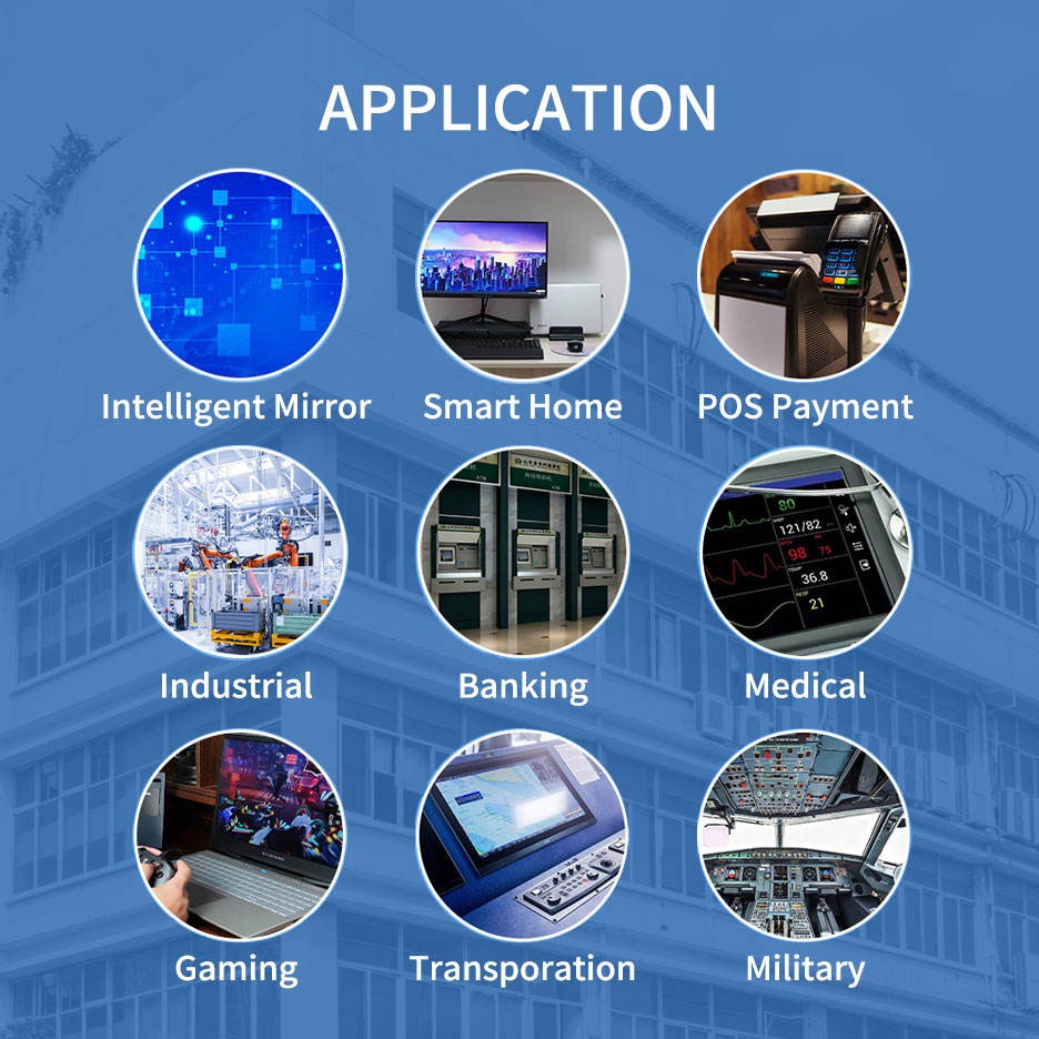 Sécurité, reconnaissance faciale, dispositifs médicaux, interface homme-machine PLC, machine de commande de nourriture, maison intelligente, console de jeu, tablette, machine publicitaire, reconnaissance faciale, équipement de terminal mobile ATM, tachygraphe (vélo), navigation automobile, caisse enregistreuse, miroir magique, pile de chargement, distributeur automatique, machine à café, imprimante, contrôle d'accès, ordinateur industriel, Raspberry PI
