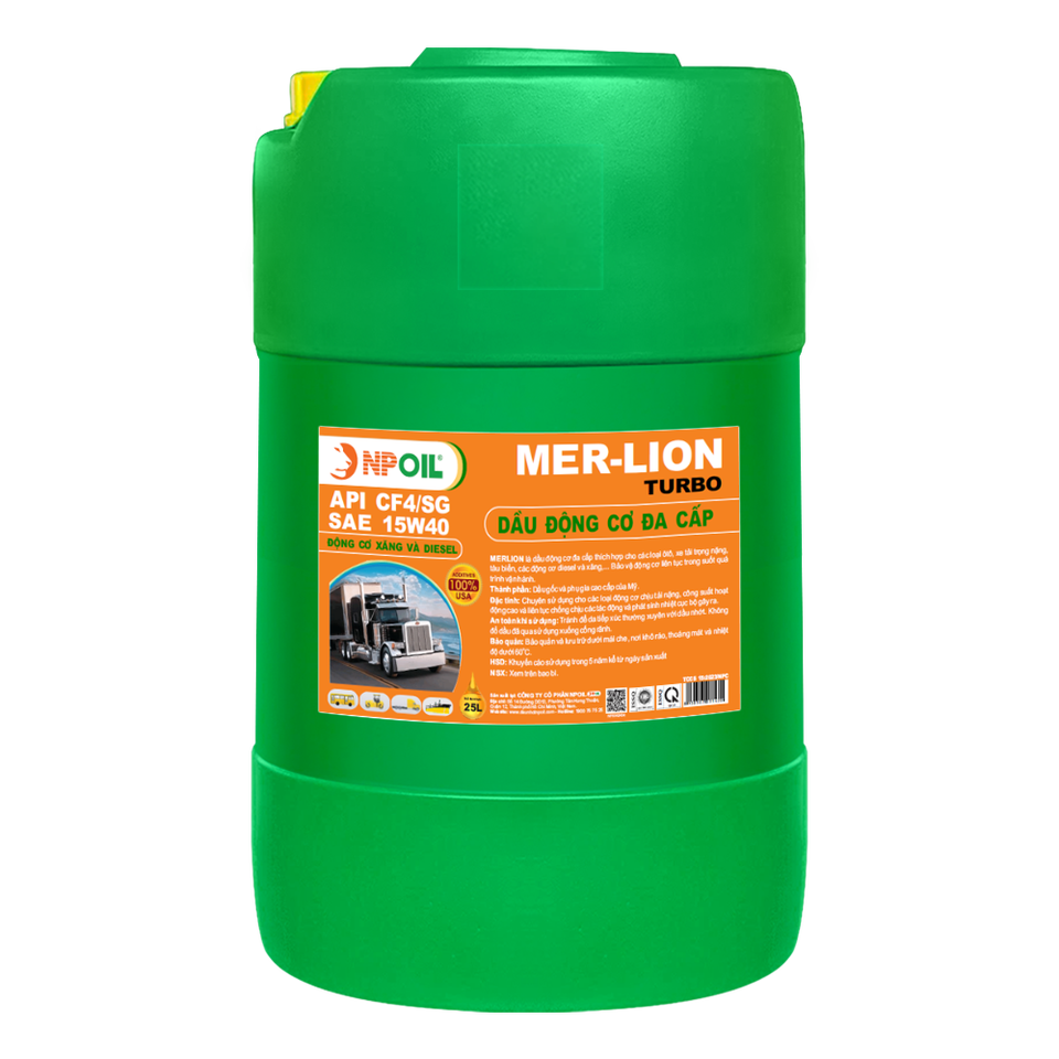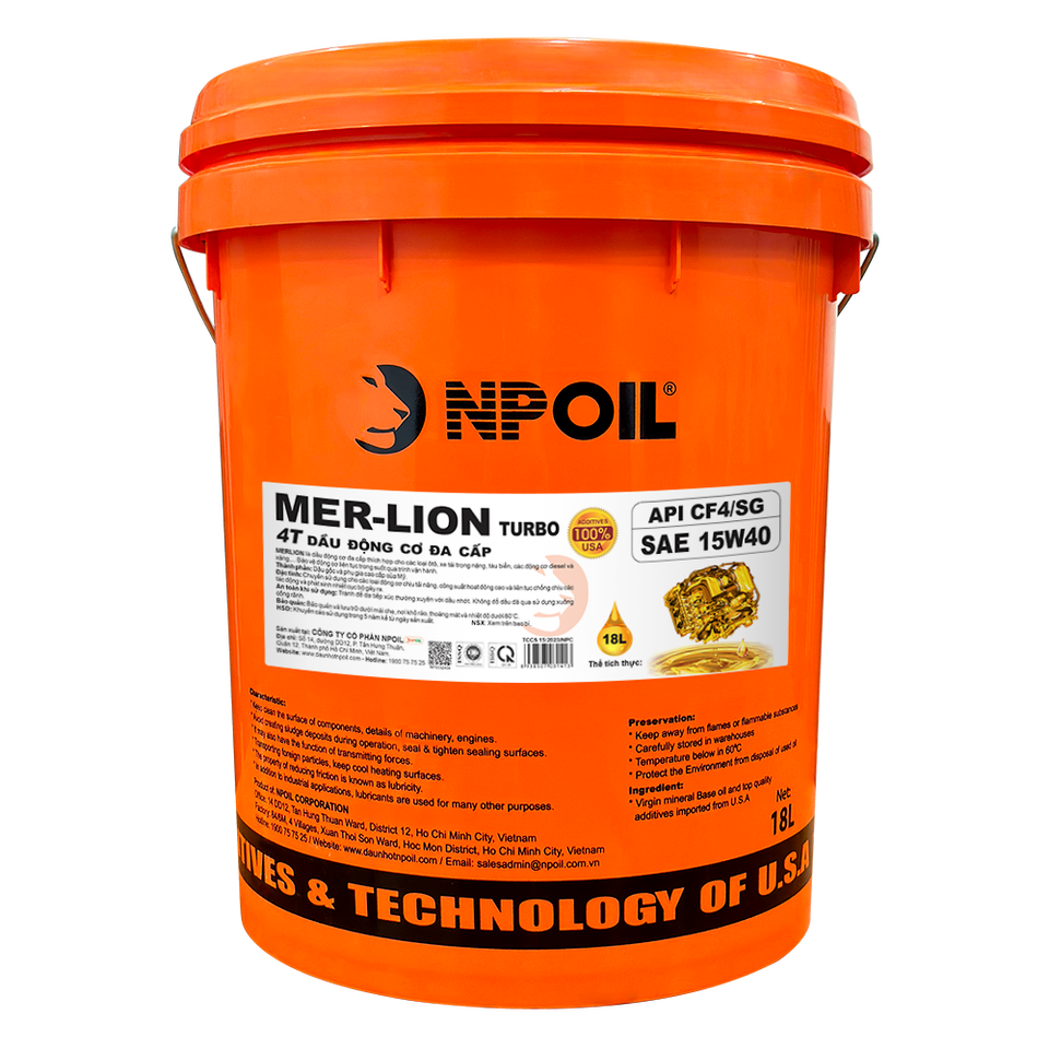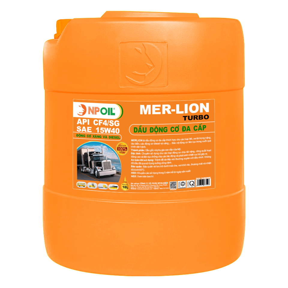 Huile moteur multi-grades NPOIL MERLION 15W40, bidon de 18L, bidon de 25L, fût de 200L. Lubrifiants de haute qualité du Vietnam.