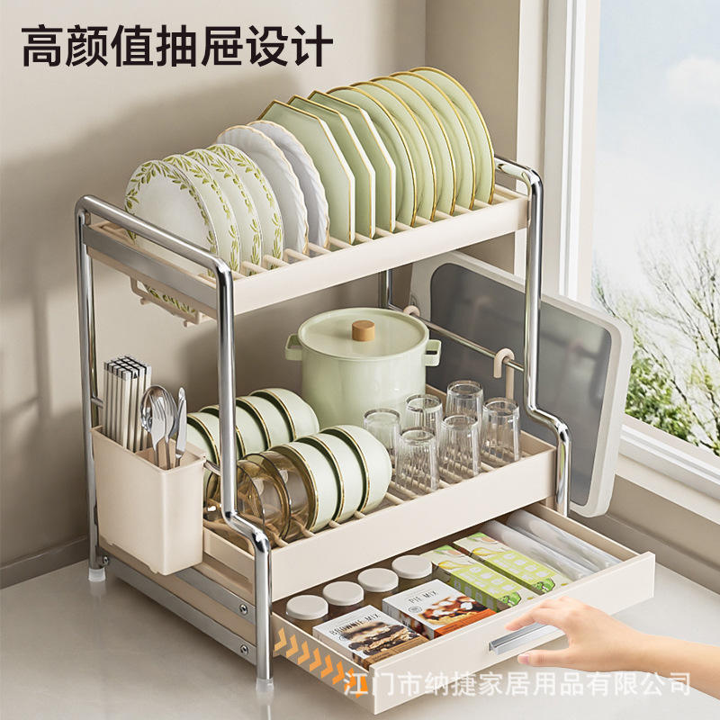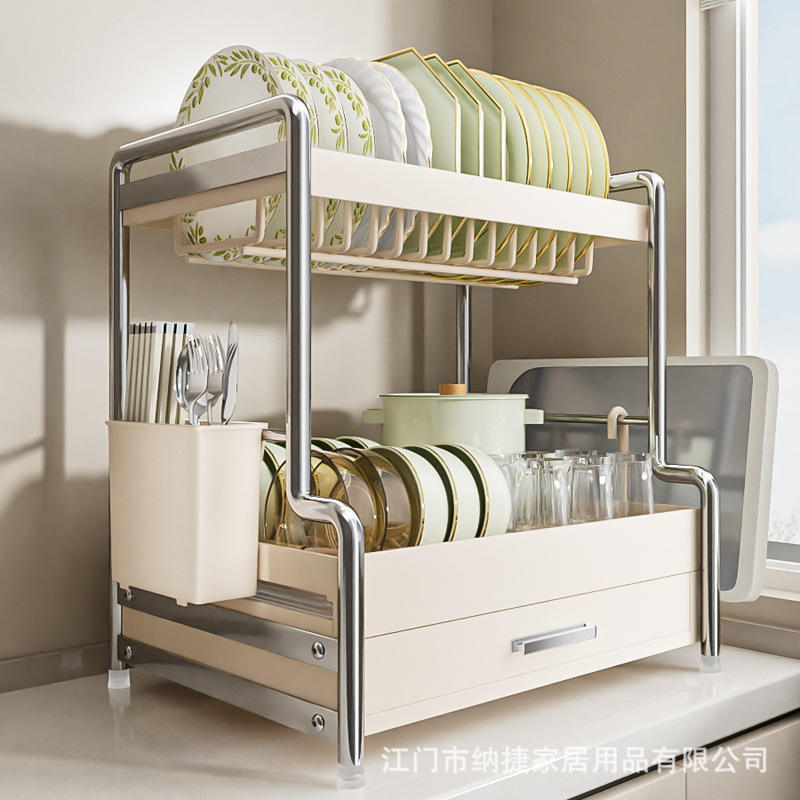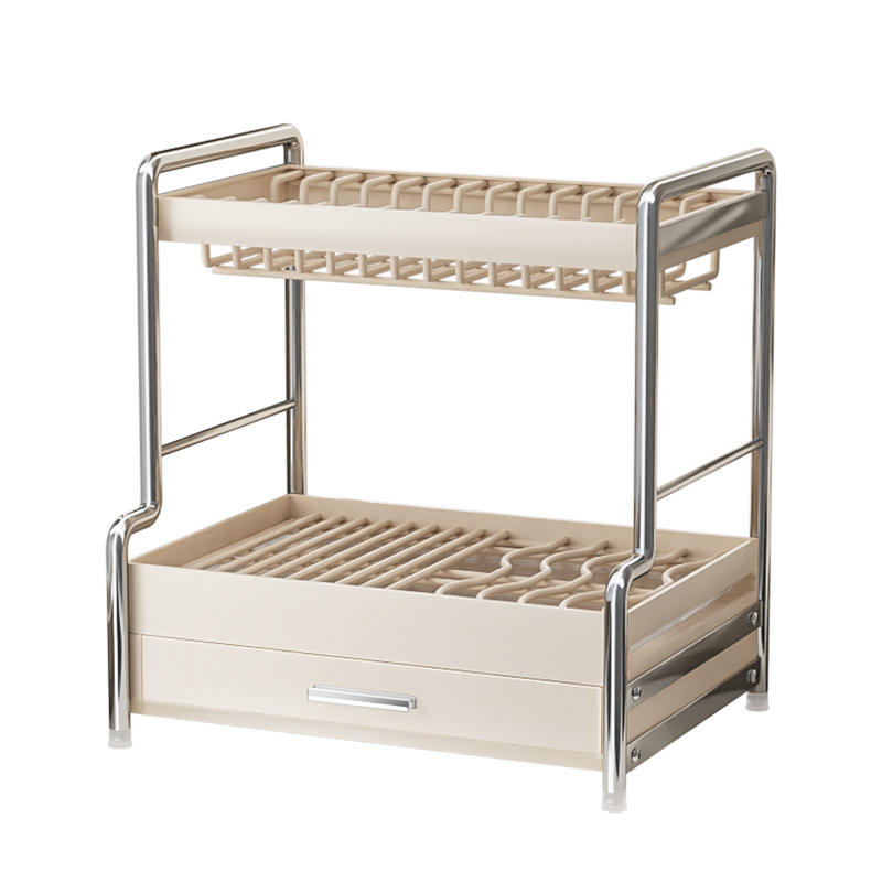 Égouttoir à vaisselle blanc crème 40 cm, double couche avec tiroirs, ensemble complet.