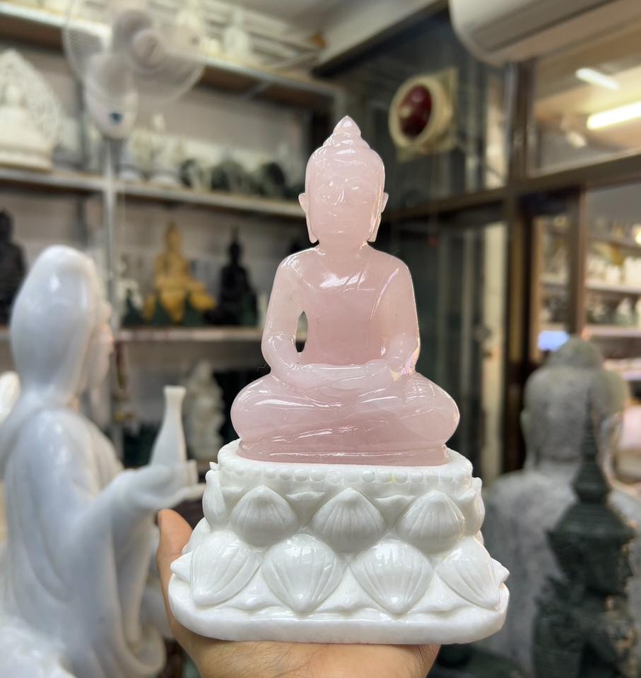 Bouddha en quartz rose sculpté naturel de 3 pouces pour la méditation, complété par un produit artisanal en pierre blanche birmane de 6.5 pouces