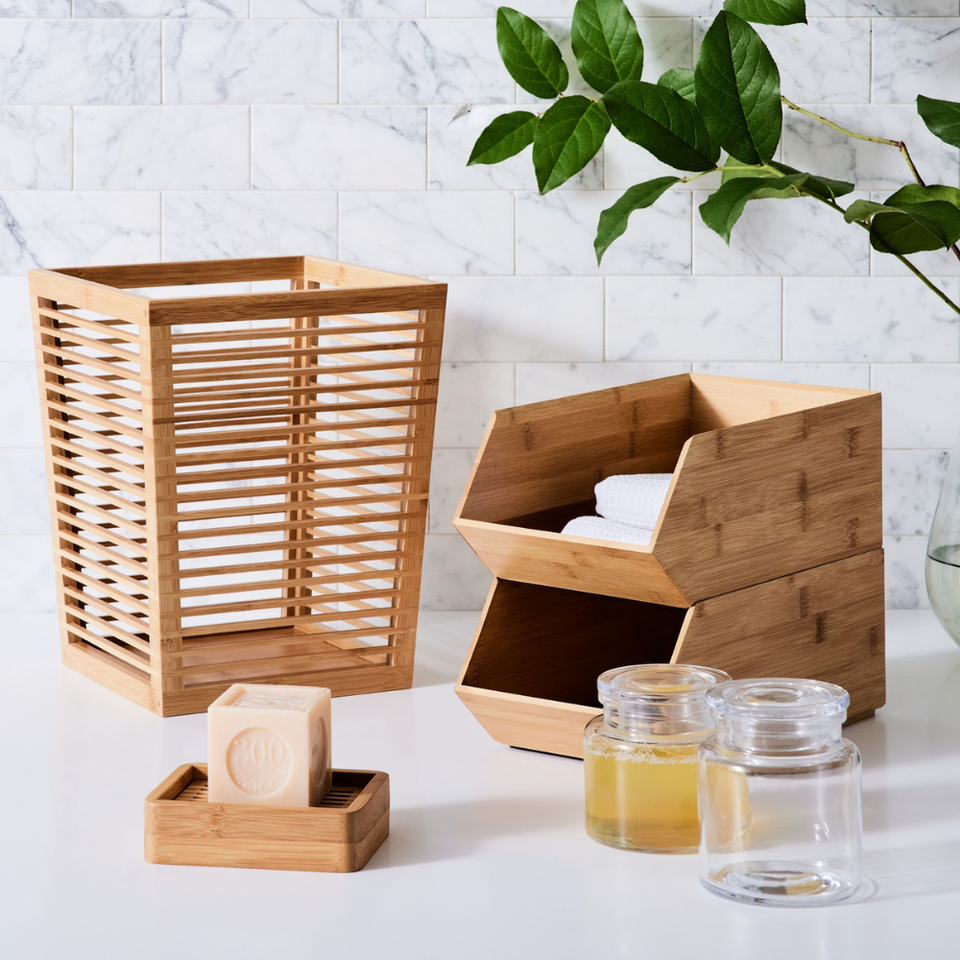 Ensemble d'accessoires de salle de bain en bambou naturel | Collection d'organisateurs de spa comprenant un panier de douche à 3 niveaux et un plateau de baignoire – Nouveauté