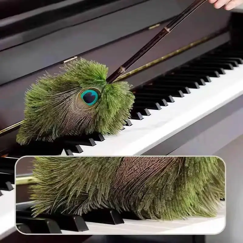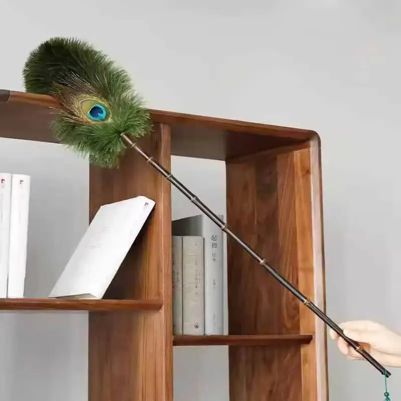 Plumeau en bambou naturel avec plumes de paon d'autruche Brosse douce de style rétro pour le nettoyage ménager Lavable et délicat