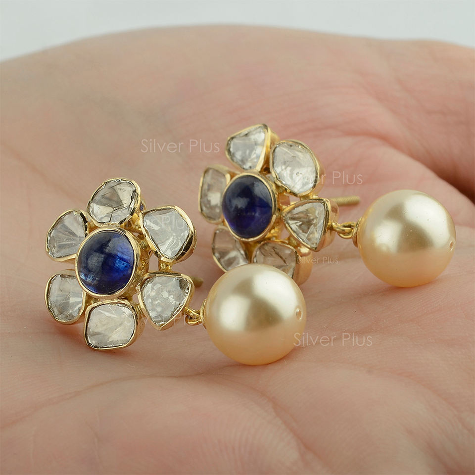 Boucles d'oreilles en perles de saphir bleu diamant naturel Boucles d'oreilles faites à la main en or massif 18 carats à vendre productibles en 10K/14K