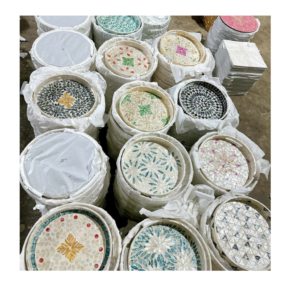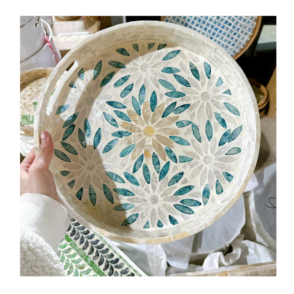 Plateau de service en rotin naturel avec incrustation de nacre, plateau tissé à la main pour la décoration de la maison