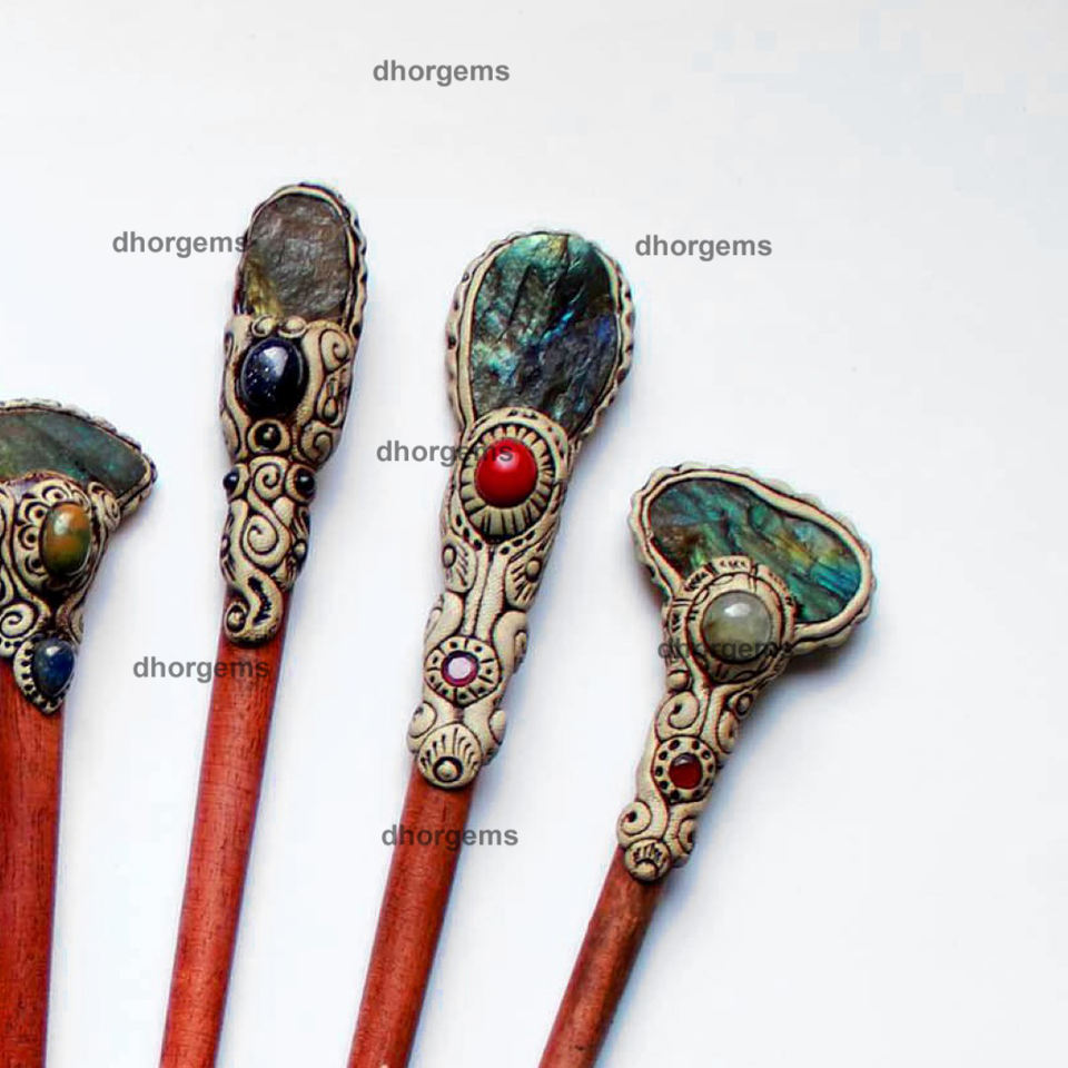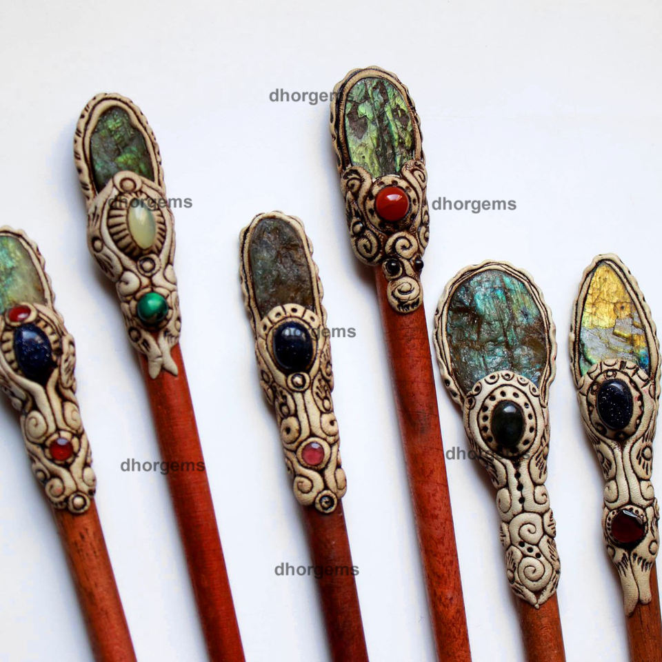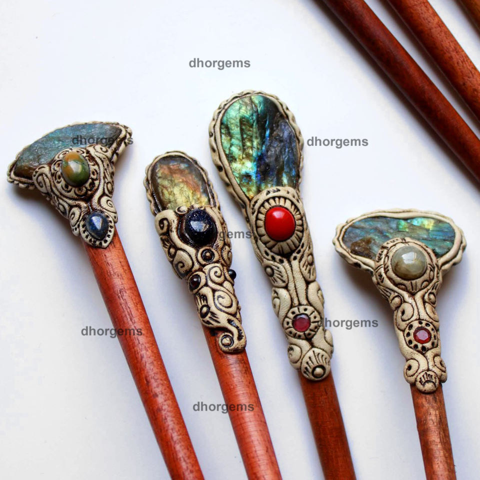 Pierre précieuse:Bâtonnet à cheveux en argile polymère avec druse de labradorite