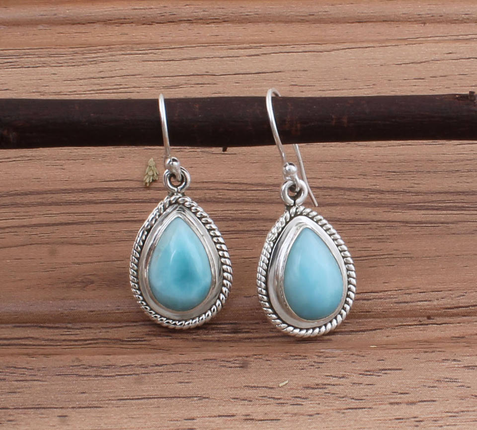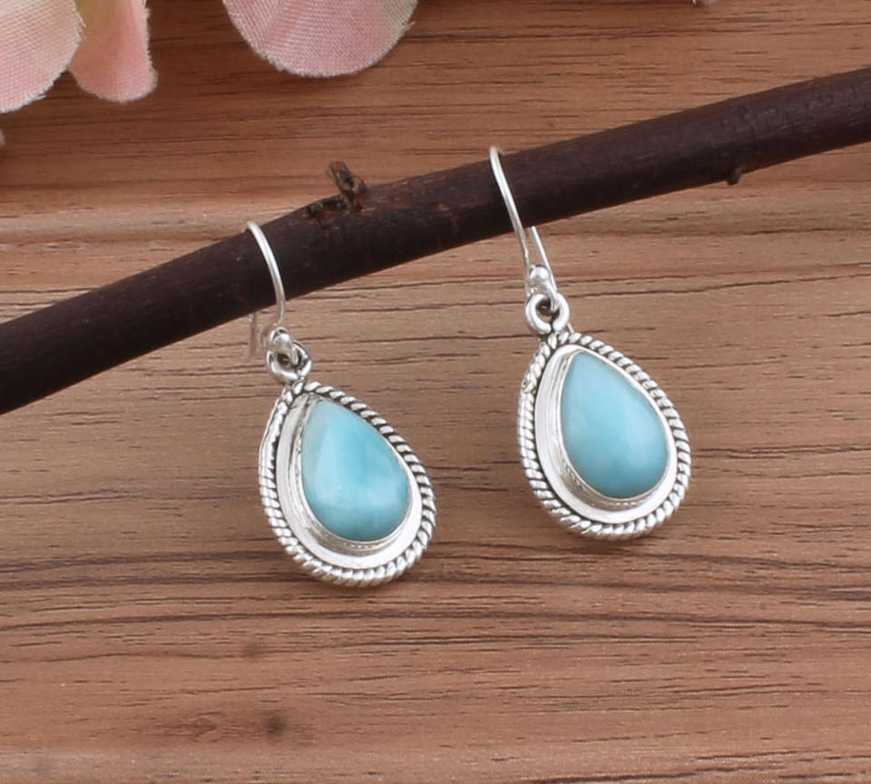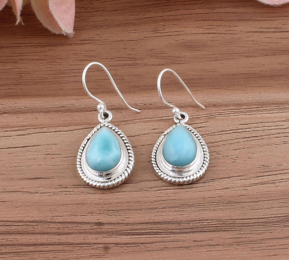Boucles d'oreilles en larimar naturel en forme de goutte d'eau serties de pierres, en argent sterling 925, bijoux de luxe faits à la main, cadeau de fête, mariage