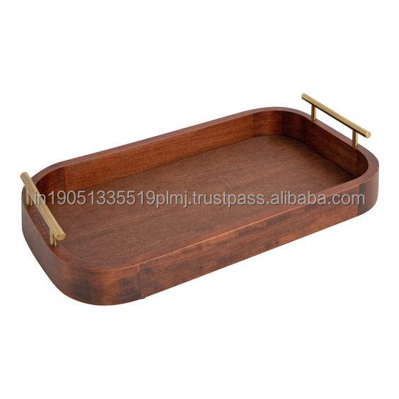 Plateau de service rectangulaire en bois naturel de mangue et d'acacia avec poignées décoratives, 14x10 pouces, finition polie, pour hôtels et restaurants