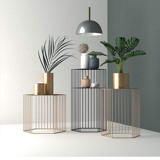 Jardinière en métal naturel avec support, complémentant les présentoirs verts organiques tout en préservant un style contemporain