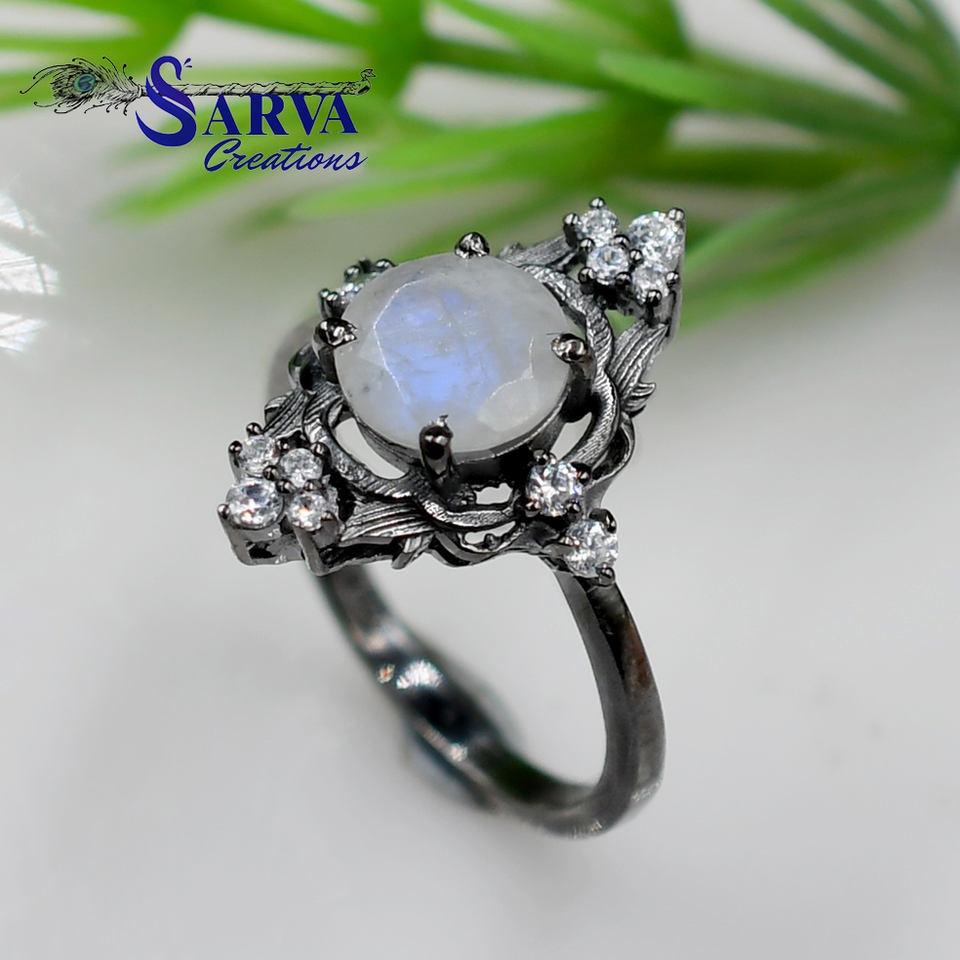 Bague en argent sterling 925 de style vintage avec pierre de lune naturelle ronde et accents de zircon cubique, bague de fiançailles pour femmes
