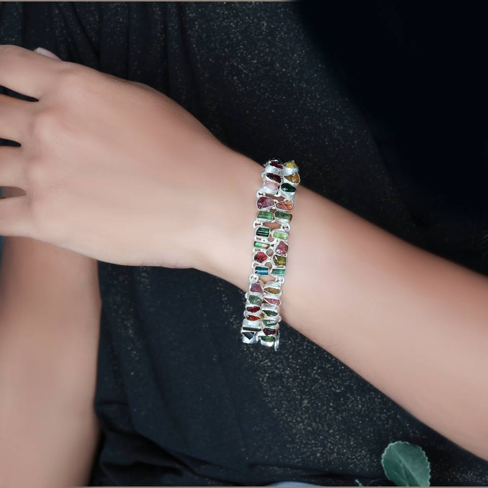 Bracelet manchette en argent sterling 925 plaqué or avec pierre brute multi-tourmaline naturelle, bijou de créateur, cadeau de pierre de naissance