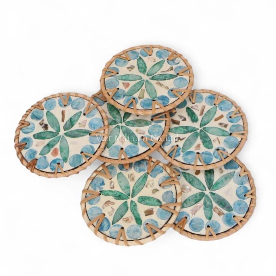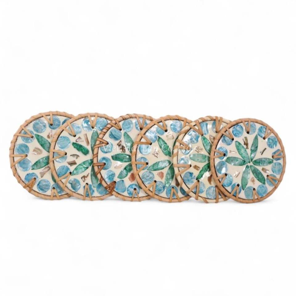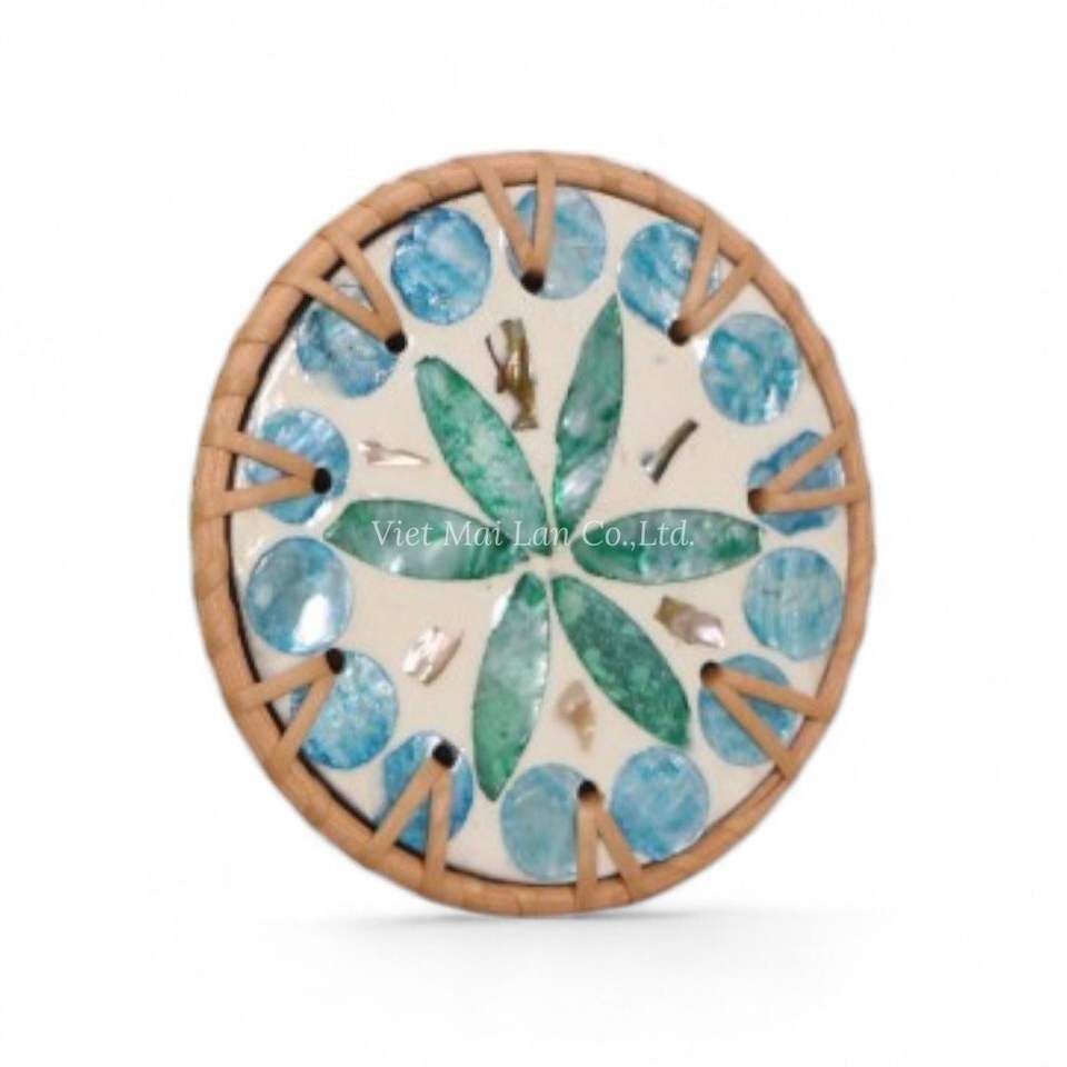 Sous-verre en rotin naturel avec incrustation de nacre pour le café, le thé et la protection décorative de table dans l'espace de vie