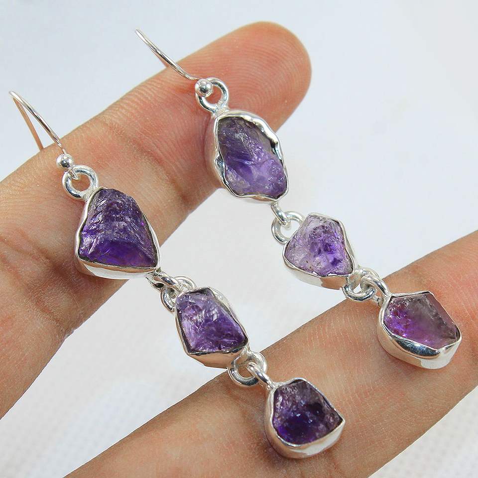 Natural Raw Amethyst Gemstone 925 Sterling Silver Long Dangle Earrings Party Wear Jewelry For Women Fine Jewellry Manufacturer