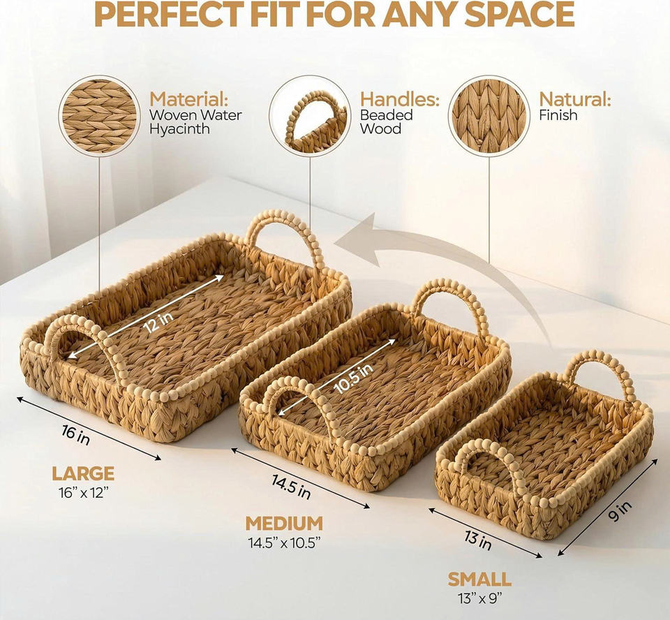 Ensemble de 3 paniers rectangulaires naturels polyvalents à emboîter avec bord festonné et poignées