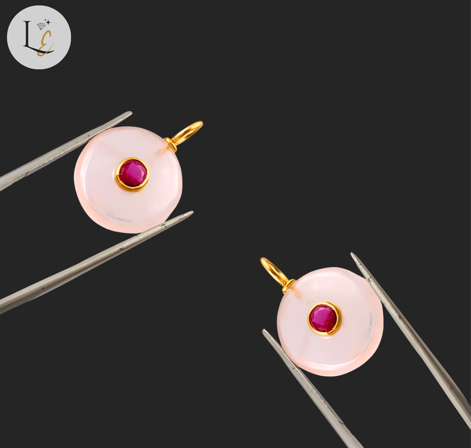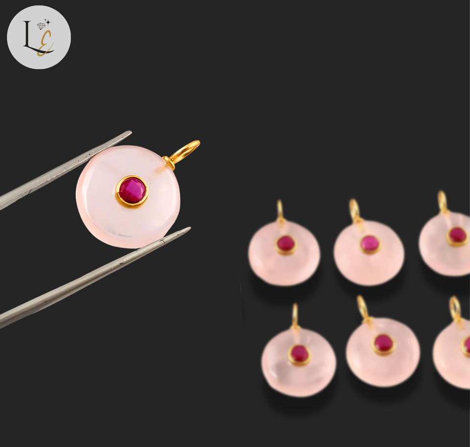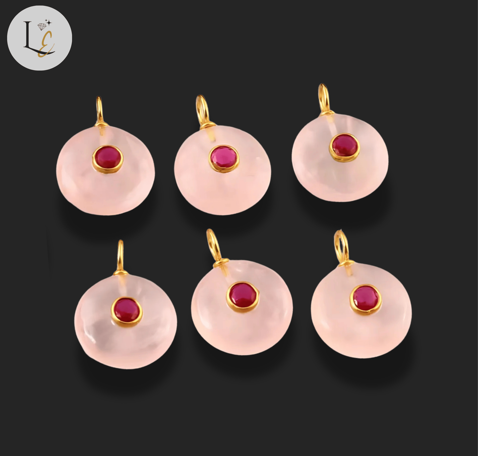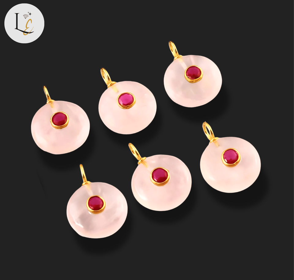 nom ou mots:Pendentif en pierre précieuse incrustée de forme ronde en quartz rose naturel