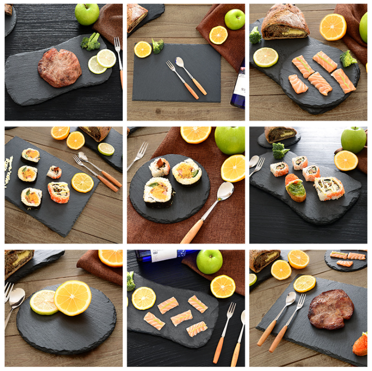 Plateau de service en ardoise naturelle, assiette en ardoise naturelle noire, planche à fromage avec poignées