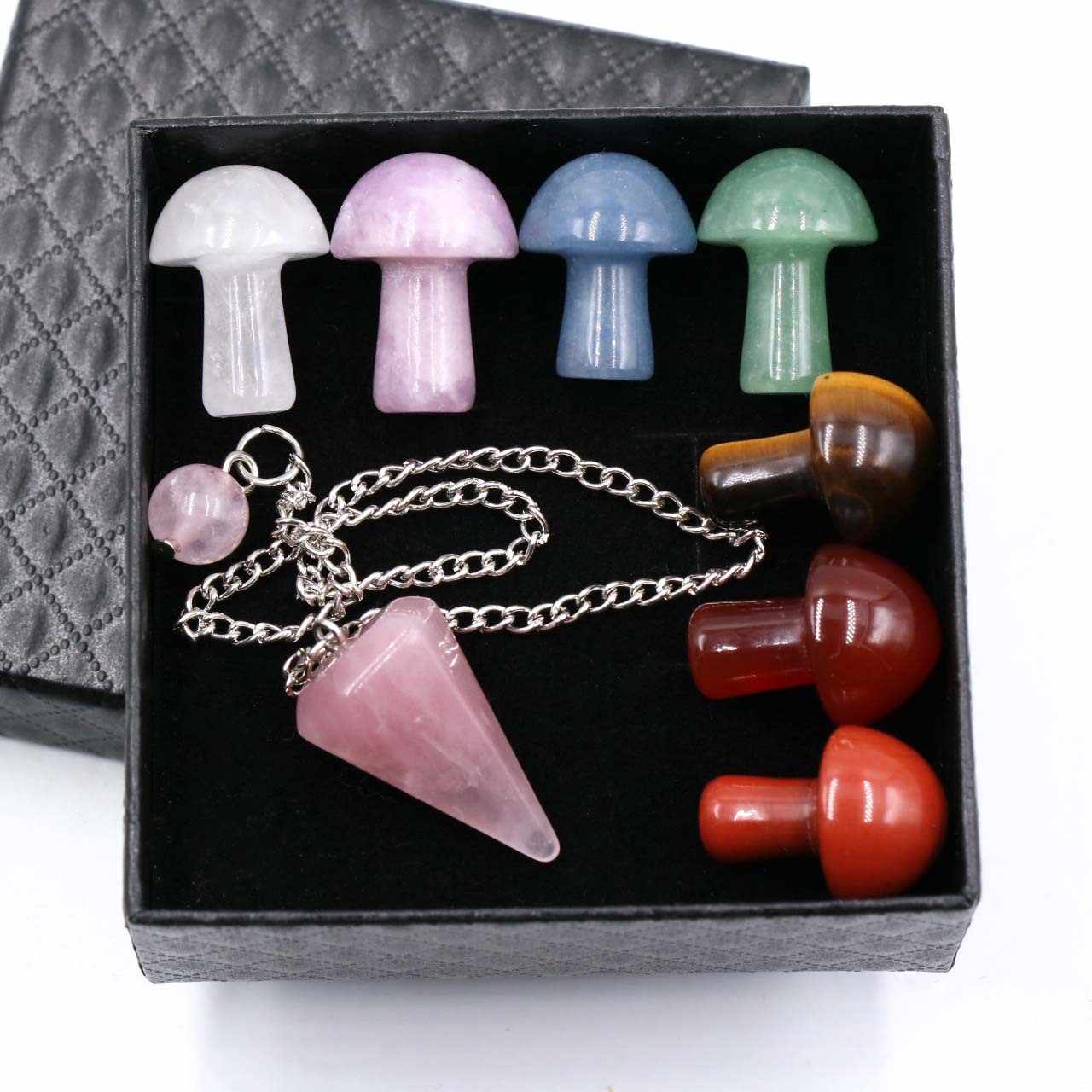 Ensemble de 7 chakras avec pendule en cristal pour guérison, 7 chakras, senseur spirituel naturelle, pierre originale de Yoga en forme de champignon, avec boîte cadeau