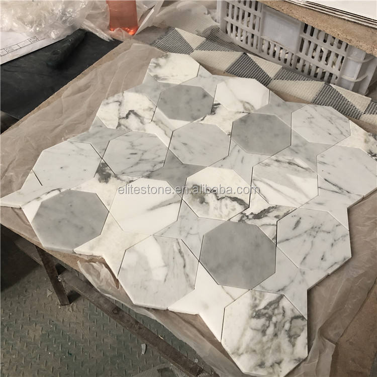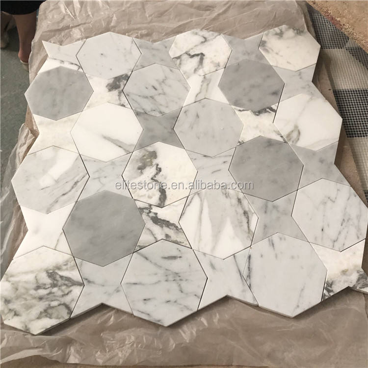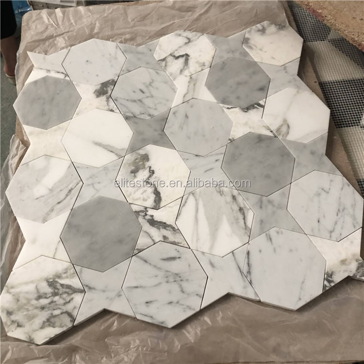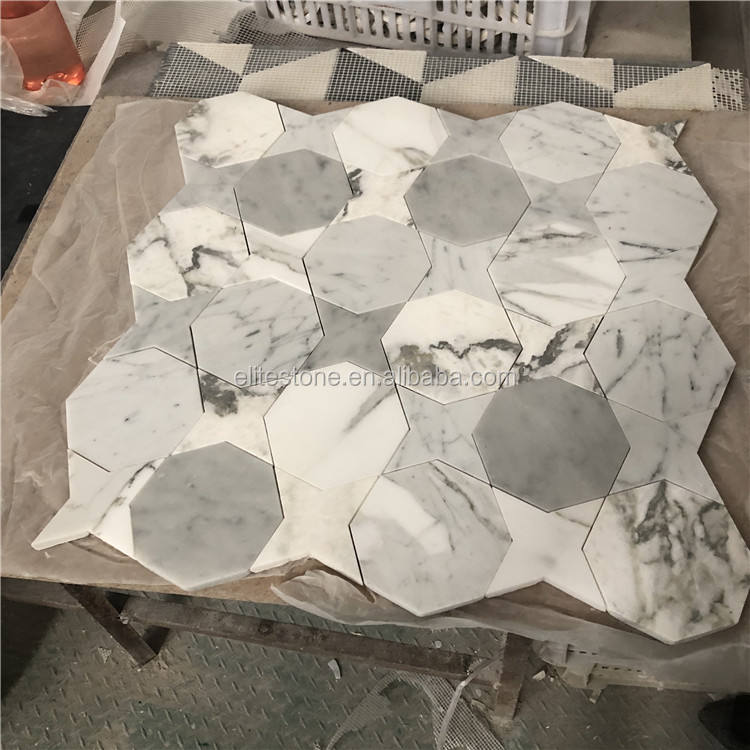 Mosaïque de Pierre Naturelle Rosa Norvegia Cristal Marbre Blanc avec Incrustation Moderne en Laiton Jet d'Eau, Plancher Mural de 10mm d'Epaisseur