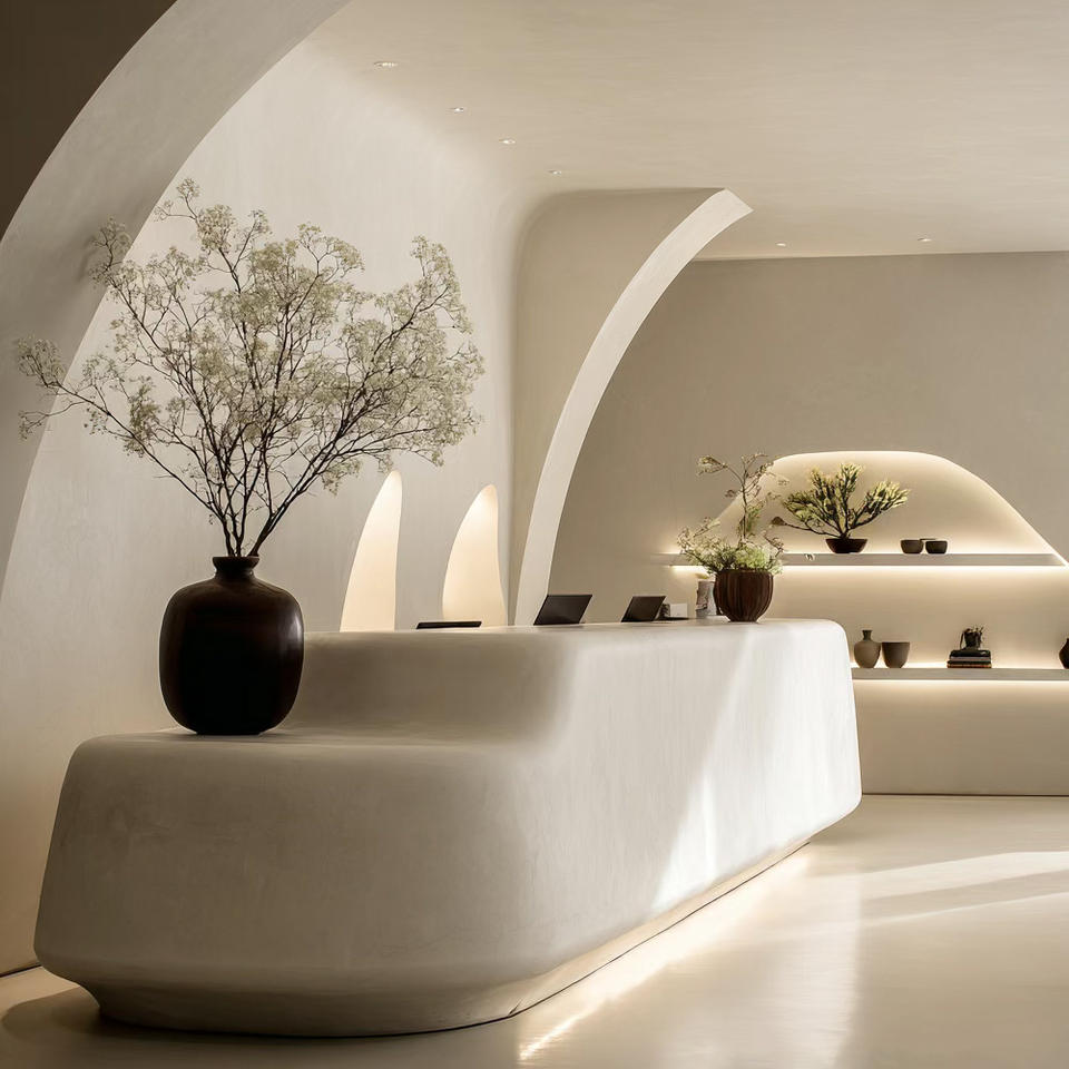 Comptoir d'accueil à ondulations naturelles avec texture de pierre sculpturale pour bureaux contemporains, espaces de réception et projets hôteliers