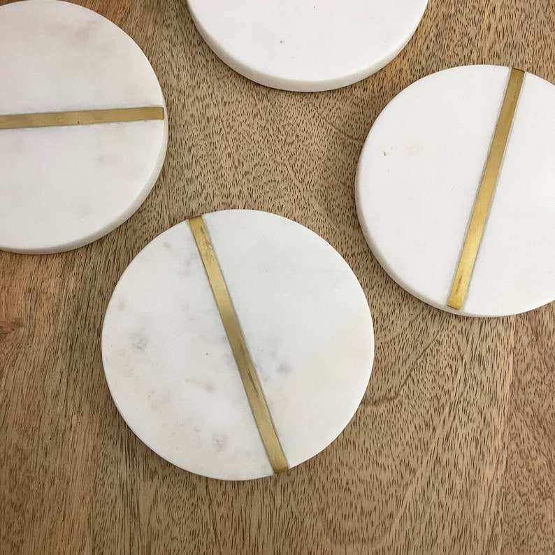 Natural White round Marble with metal inlay, coaster set, 4.5x4.5 inch, Set of 4
